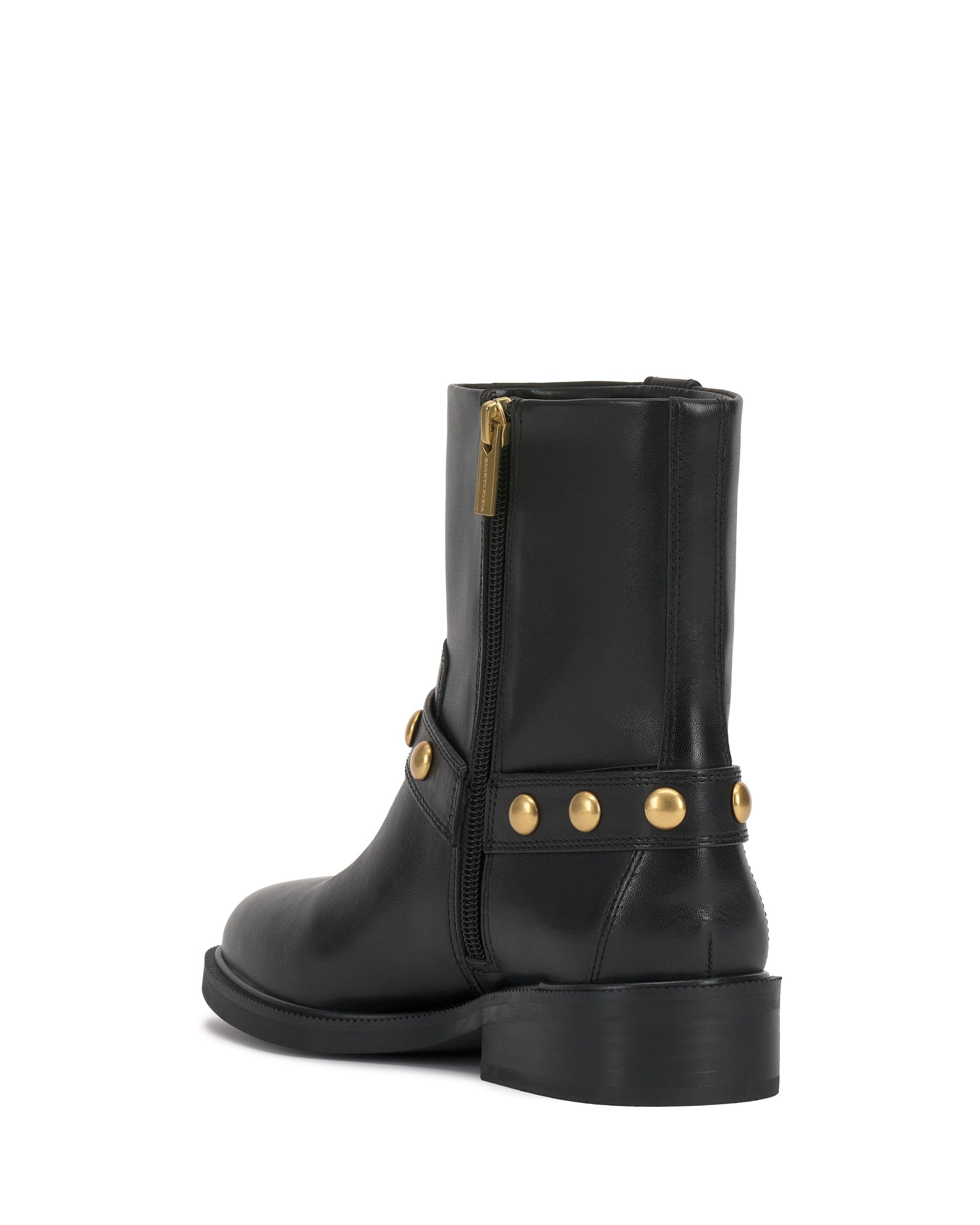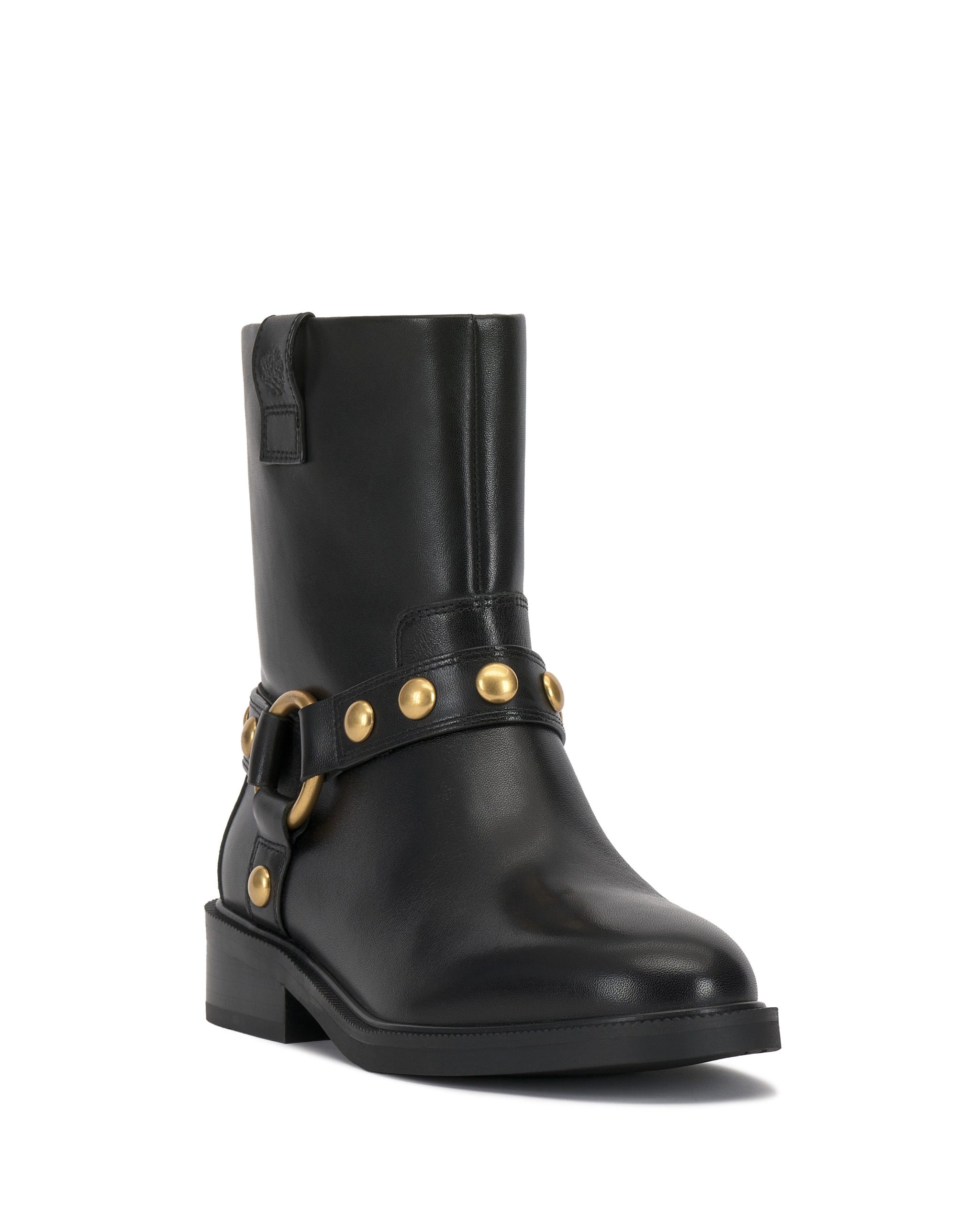 The Amais moto bootie is the perfect way to add modern edge to your wardrobe. The classic ankle boot silhouette is upgraded with a studded harness strap and a low block heel. The inside zipper closure adds convenience to your routine while the padded footbed supports every step.